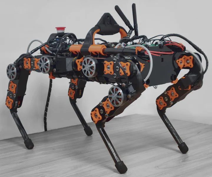 Presentamos un nuevo diseño de cuadrúpedo de 12 grados de libertad, centrado en reducir el costo y la complejidad de fabricación y maximizar el uso de componentes disponibles regionalmente. Para facilitar el ensamblado, las piernas son modulares, y los motores están lo mas cerca posible del cuerpo para reducir su inercia. Se utilizan motores brushless junto a controladores Odrive que permiten un control simple con su interfaz por CAN. El cuerpo contiene los motores de los hombros y toda la electrónica necesaria para su funcionamiento. Para controlar el cuadrúpedo se implementa el sistema operativo ROS2. Todos los procesos cruciales para el funcionamiento del robot se corren en la computadora a bordo, y los demás en una computadora externa. Se demuestra experimentalmente que cada pierna es capaz de saltar hasta 30 cm con un peso similar a un cuarto del cuerpo. Se ensayó el robot con peso agregado de hasta 4 kg y se observa buen rendimiento. Se creó un simulador en Pybullet para evaluar algoritmos de autonomía de manera eficiente. El costo total del robot es de aproximadamente 3000 USD. Todo el software y los modelos del hardware son de diseño abierto y pueden encontrarse en un repositorio público.